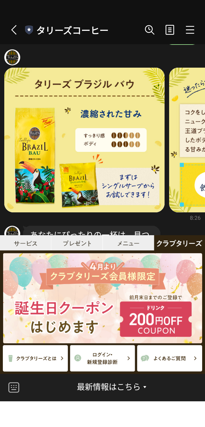 トップ > なんでも写真館 > 本日のタリーズ > 結果 オブリ 2026/03/18 08:33 結果 診断の結果は、バウでした。 バウバウ! 本日のコーヒーもブラジルを用意して いる店舗があるそうです。 どうも今日限定みたいです。 いいね 共有する 共有する X facebook LINE リンクをコピー コメントする 2 件の返信 (新着順) ミュートしたユーザーの投稿です。 投稿を表示 ジャスミン 2026/03/18 23:52 誕生日クーポン始まりますね- ̗̀ 🎂 ̖́- 嬉しいですね いいね 返信する ミュートしたユーザーの投稿です。 投稿を表示 森のカフェ 2026/03/18 10:55 こんにちは。 私も同じでした。 家にジップスの在庫があったので朝飲みました。 これからホムタリ行きます。手ぬぐい買いに🙂🍀 ホムタリの本日のコーヒーが楽しみです。 いいね 返信する