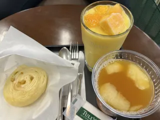 新メニューは元気が出る色黄色づくしになりました🟡ビタミンカラー🫶 マンゴー🥭しっかり甘くて贅沢気分で飲めました♪ グレープフルーツの方は氷無し🧊ティー多めの、グランデサイズです もちもちホワイトパンはヒーティングしていただきました😊フェローさんからお声がけがなかったら、