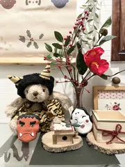 節分準備 🧸に鬼のパンツ探してたのなかなか気に入ったの無くて😅一から作るとか出来ないしキャンドゥで見つけた鬼パンキッズ用を🧸sizeにします(これが1番👹っぽい柄)でっかいから3分の1ぐらいにするよ裏にして縫ってゴム入れたムチムチしてるけどきゃわいい💕きゃわいい💕 えーきゃわいいよねー👹さんがきゃわ