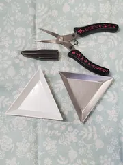 パーツを繋ぐ丸カンや爪付き石座にクリスタルを固定する時などにとっても便利な平ヤットコ。先が尖っているのでキャップ付きを選ぶことをオススメします。 三角形のビーズトレイ。パーツの種類ごとに分けて使えます。三角だからパーツがこぼれにくく後片付けにも便利。 アクセサリーのハンドメイドを