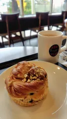 ふんわり温かい♪シナモンの香り 午前中にヒトシゴト済ませたので、シナモンロールと本日のコーヒー【ブラジル】で休憩しました温めてもらったシナモンロールは、ふわっといい香りでしたヘーゼルナッツが好きです♪そしてこのカリカリと楽しい食感は、調べてみたら大豆パフェなんですね!それに、生地にチョコチップが入ってた…!気づかずに美味しく食べて