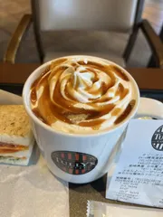 先日、長野県 佐久平店で見つけたフェローさんオススメカスタム コーヒー香るキャラメルほうじ茶ラテ都内店舗で作ってもらいました〜 ほうじ茶ラテキャラメルソースホイップキャラメルシロップエスプレッソショット ハムチーズサラダサンドと一緒にランチです✨佐久平店のレコメンドポップ