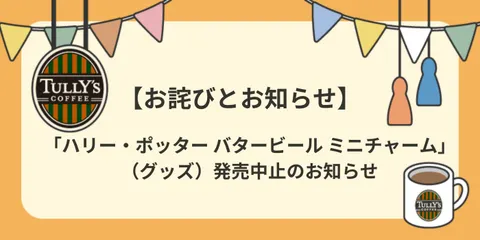 【お詫びとお知らせ】「ハリー・ポッター バタービール ミニチャーム」発売中止について タリーズ運営事務局です。日頃より、「TULLY’S community Hello! 」をご利用いただきありがとうございます。 このたび、2025年4月2日(水)発売を予定しておりました「ハリー・ポッター バタービール ミニチャーム」につきまして、一部の商品に汚れが付着するなどの不具合があ