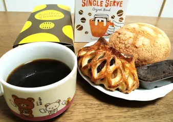 天気がいいので外出したいのですが、午後から在宅の必要があっておうちタリーズです。ハッピーバッグに入っていたジップスシングルサーブを愛用のリラックマのマグを使って例の淹れ方で。おともは木頭ゆずのブラウニーと地元ベーカリーのシナモンレーズンアップルパイとメロンパン。蒸らしは勿論、バッグをお湯に浸して蓋を