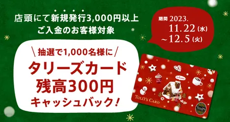 「タリーズカード新規発行 キャッシュバックキャンペーン」のお知らせ!2023年11月22日(水)~12月5日(火)の期間中店頭にてタリーズカード新規発行時に3,000円以上ご入金いただいたお客様の中から抽選で1,000名様に、タリーズカード残高300円がキャッシュバックされるキャンペーンを実施中!は