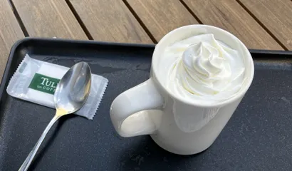 テラス席で 今日はお休みなので、ラテにふわふわホイップをトッピングしてみました!ちょっとずつ溶かしながら飲むのが美味しいです。