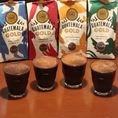グァテマラ4種テイスティング 私見ですが、写真の左側から右へ・ウニオン ドゥラズニート農協:マスカットのような甘味で今は販売しているか不明ですがラム酒入りチョコがイメージされたのでラムレーズンなどが合うのかな?・トードサンテリタ農協:ナチュラル製法かと思う華やかな香りとコクを感じました。 キャラメルとチョコ
