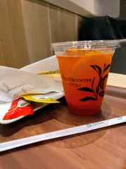 ポイさん 詳細なレポートありがとうございます😊 私も行ってみました。と言っても上野にコンサートを聴きに行った寄り道なので少し早めに家を出て、お昼過ぎに虎の門ヒルズに着いたので、グランドオープン記念のプレゼントは終了していました。 スタイリッシュな内装のオシャレな店舗でした😊 まだ冷たい飲み物をたのむ