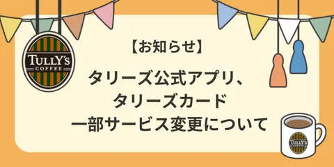 【お知らせ】タリーズ公式アプリ、タリーズカード一部サービス変更について いつもタリーズコーヒー及び「TULLY’S community Hello!~タリーズ好きがあつまるみんなのカフェ~」をご利用いただき、誠にありがとうごいざます。 この度、2025年8月6日(水)より下記サービス内容を変更させていただくこととなりましたのでご案内いたします。 &n