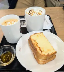 おはようございます☀️ とある日のモーニングです 私は クロックムッシュ カフェラテのキャラメルソース追加 ハチミツ別添え。連れ合いはアイリッシュラテ。 初めてのクロックムッシュ美味しい✨ 連れ合いに一口あげて美味しい?と聞いたら んふぅ
