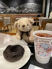 黒ドーナツ🍩 白ドーナツ売り切れで 黒ドーナツ食べましたビターカカオドーナツです甘いかな?と思ってアイスティーにしたけど そこまで甘くなかったです ビターだもんね写真撮ったり 動画撮ったりとドーナツアップにしたら ん?アスファルト?溶岩?ん?なんか似てない?ザクザクした所が特に!あっ失礼しました🤭表現!表現!と自