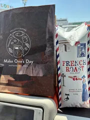 素敵 「いい感じの紙袋なので入れますね」…今日はマイバックお休み。 店舗が入っているショッピングモールのバーゲンに伴い、豆2袋でシングルサーブプレゼント。細かく挽いてアイスコーヒーがお勧めアドバイスで、フレンチ2袋にしました。豆の袋がかわいい。本日のコーヒーもフレンチ。気分はフランス🇫🇷とオード