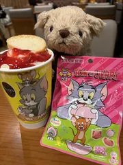 🧸がボケた🤭🍓飲むつもりでいちごの飾り物持って行った😆 トムジェもいるよ🐭😺なんか投稿難しくなった?慣れないだけ?んー😕ついていけないかも😭動画も載せられる?ん❓❓ばっかり❓以上 いろんな事は出来ないまゆでした🧸