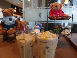 美味し〜い(^^) ホワイトショコラオランジュラテ アイスでいただきました🥤🗣️/スプーン🥄ご使用されますか?🗣️/はい٩( ᐛ )و上に乗っているクリームとオレンジの果実🍊モリモリすくって食べちゃいました😋買い物して喉乾いていたのでとーってもアイスが美味しかったです♪最優秀ドリンクサイコー👍