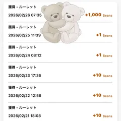 2月に入ってからずーーーっとほぼ1か10しか出ないという悪夢のようなルーレットでしたが 本日やっと!! ✨️1,000Beans🫘✨️ (ง°̀ロ°́)ง💛キター!!✨ 長かったぜ⋯( ´ー`)フゥ