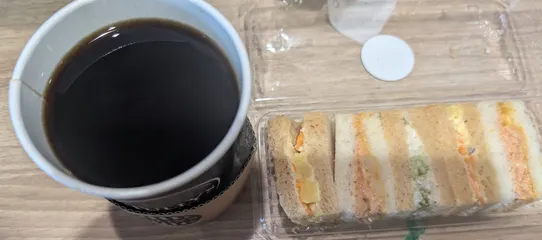 お気に入りのサンドイッチ2回目 3種のデリ風サラダサンド発売されてから2回目に食べるこちらのサンドイッチ🥪中身が凝ってて美味しい🤟組み合わせが最高✨ お供は本日のコーヒー☕️