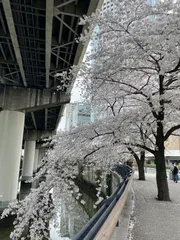 東京は花盛り JR水道橋駅付近の桜並木はこんな感じです。日本橋川の上を通る首都高速道路やオフィスビルに囲まれて、満開の桜並木が美しいです。東京の春、ていう感じがします。